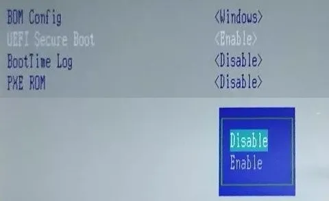 确认 BOM Config 为 Windows,把 UEFI Secure Boot 设为 Disable