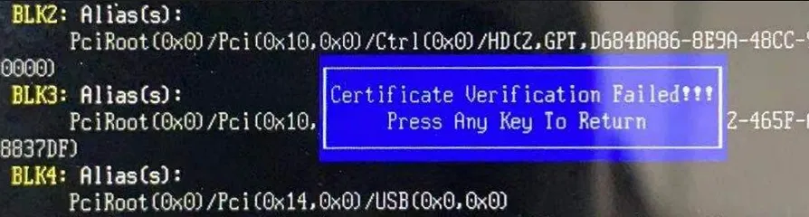 如果出现 “Certificate Verification Failded”蓝框,请长按电源键重启,再按《关闭安全启动》中说明重新关闭安全启动。