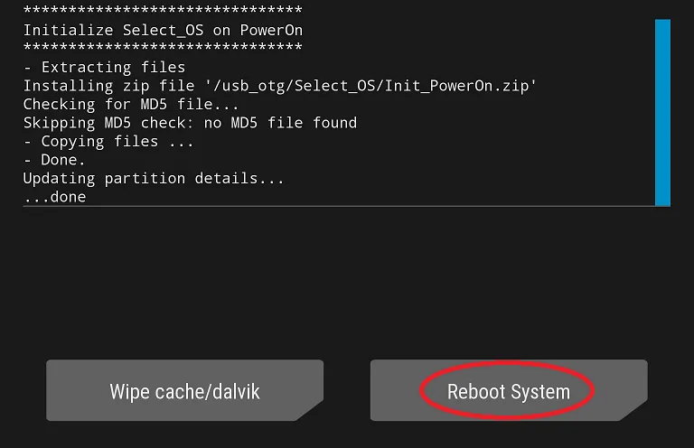 安装完毕后,点右下角的 Reboot System 重启平板。注意:不要拔下 U盘。
