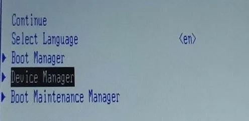 平板将进入 BIOS 设置。 进入 BIOS 设置后,通过音量+、- 键移动光标,电源键确认,选 Device Manager。