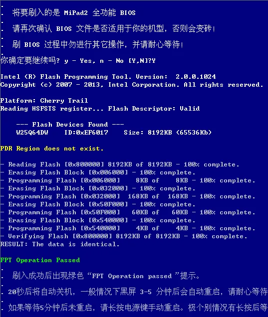 将开始刷入BIOS,一般半分钟左右完成。等待20秒钟自动关机,黑屏3-5分钟后自动开机进入PE,至此 BIOS 更新完毕。 如果等待5分钟以上未自动开机,请长按电源键手动开机。极个别有长按后等半小时才开机的,不要轻易得出“已变砖”的结论。