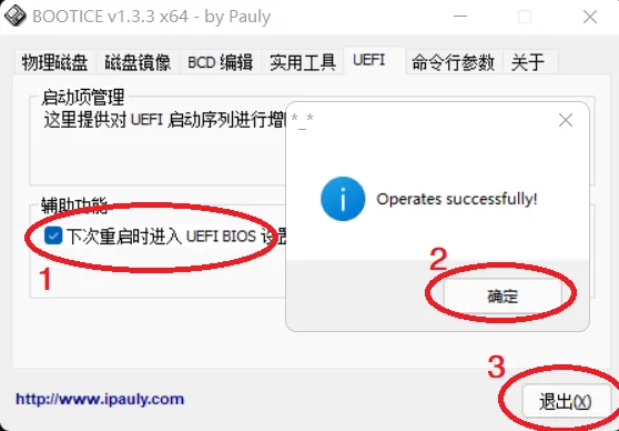 选择“UEFI”页签,勾选“下次重启时进入UEFI BIOS 设置界面”,再点“确定”,然后点“退出”。