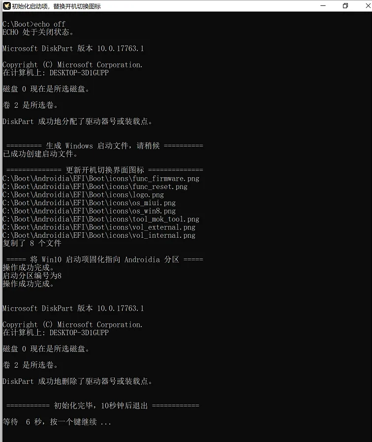 在 Win 中,双击运行 C:\Boot 文件夹中的快捷方式“初始化启动项,替换开机切换图标”。这个带飞鸟图标的程序用于固化启动项,避免无法切换到安卓系统的问题。